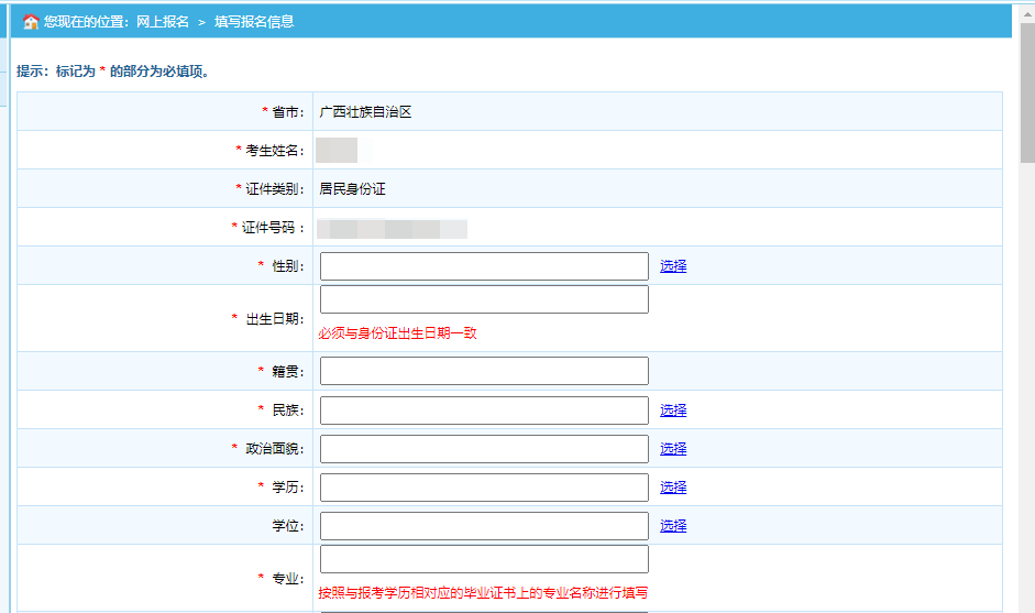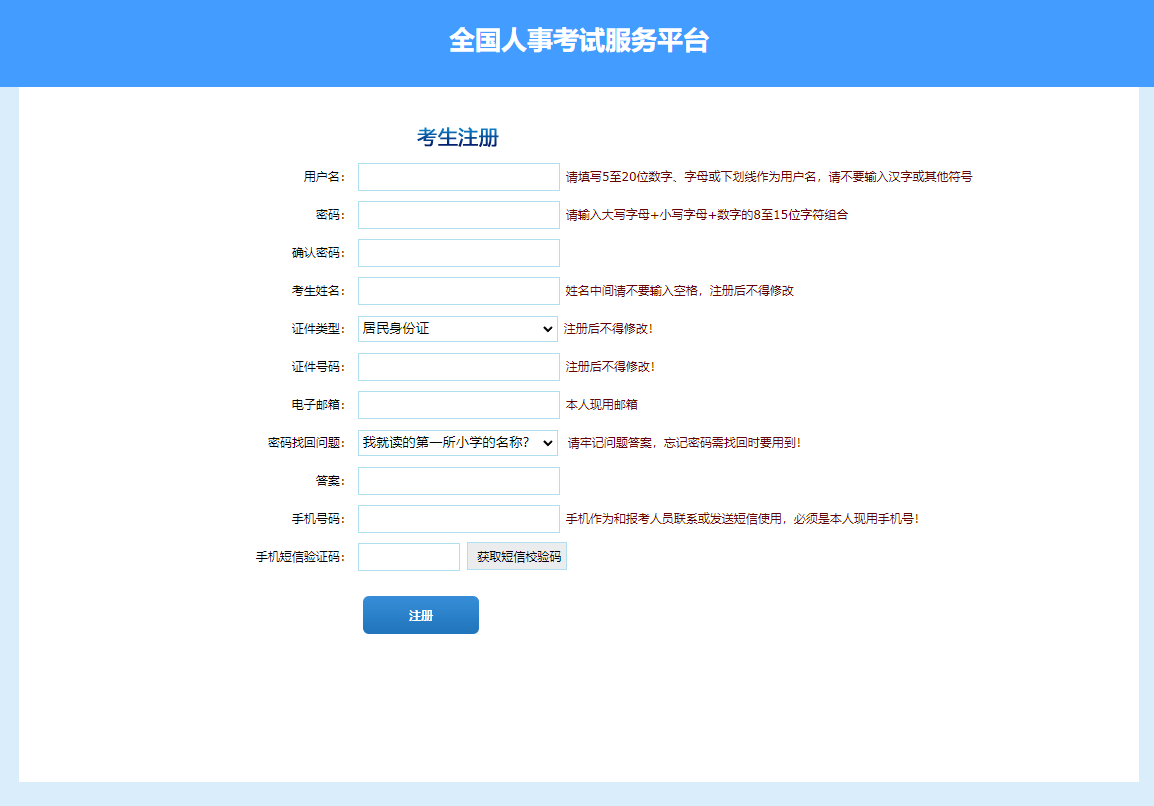 第二步:點(diǎn)擊“注冊”,進(jìn)入考生注冊頁面,考生注冊填寫個(gè)人信息