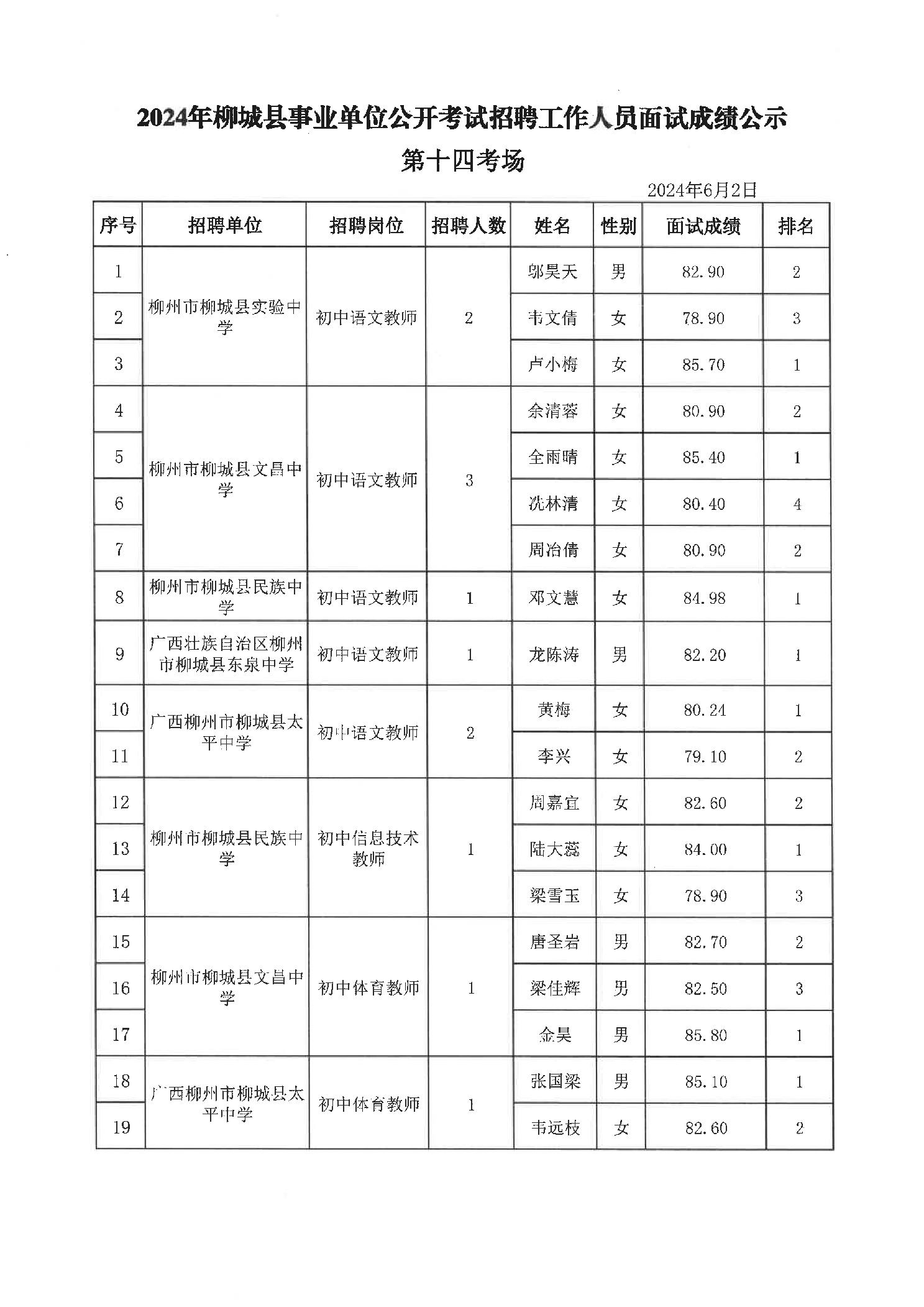 原文標(biāo)題:2024年柳州市事業(yè)單位公開考試招聘工作人員面試成績公示(柳城縣崗位)
