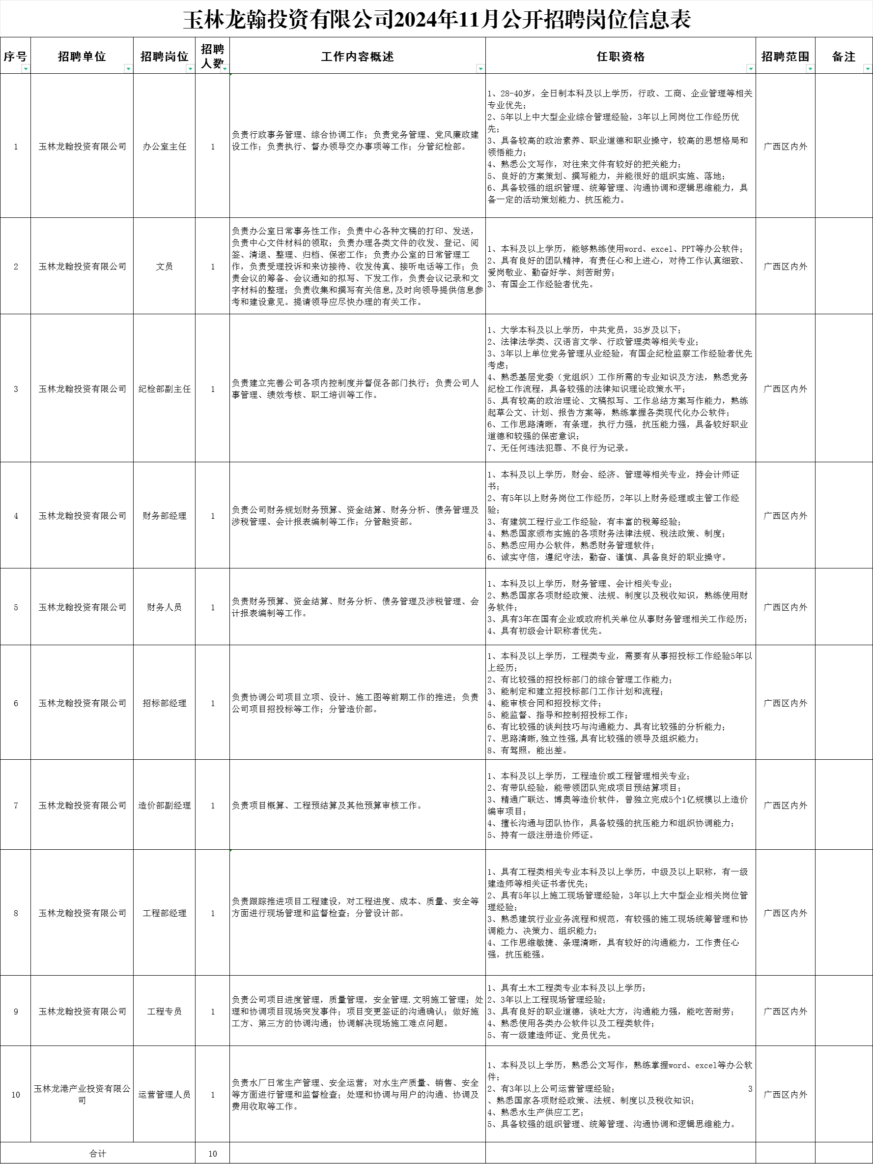 附件1:玉林龍翰投資有限公司2024年11月公開(kāi)招聘崗位信息表.xlsx