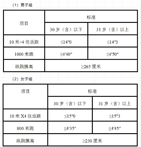 3.參照《關(guān)于印發(fā)公安機(jī)關(guān)錄用人民警察體能測評項(xiàng)目和標(biāo)準(zhǔn)(暫行)的通知》(人社部發(fā)〔2011〕48號(hào))的項(xiàng)目及測試規(guī)則,結(jié)合《公安民警體育鍛煉達(dá)標(biāo)手冊》成績標(biāo)準(zhǔn),體能測評的項(xiàng)目和標(biāo)準(zhǔn)如下: