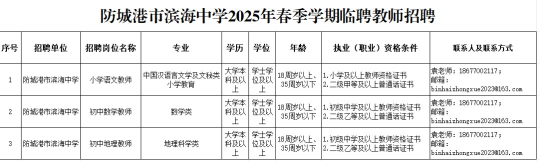 二、報(bào)名方式:1.將個(gè)人簡歷、學(xué)歷學(xué)位證書、教師資格證等發(fā)到郵箱:binhaizhongxue2023@163.com(郵件名稱備注:姓名+崗位+聯(lián)系方式)2.聯(lián)系電話:袁老師/18677002117