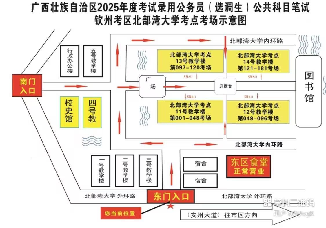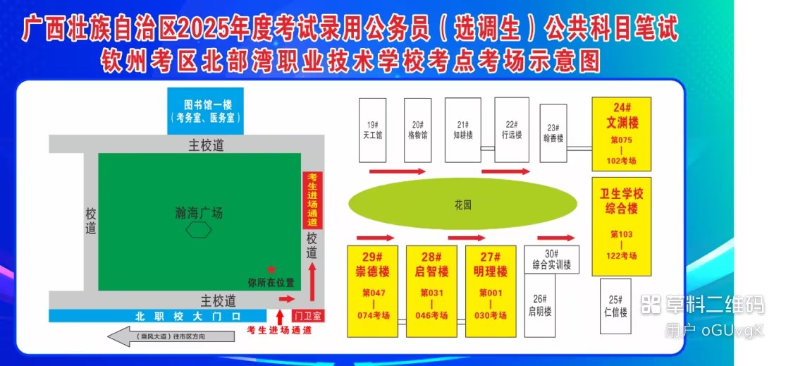 欽州考區(qū)共設(shè)兩個考點,分別為北部灣大學(xué)考點、北部灣職業(yè)技術(shù)學(xué)??键c。(考點地址和具體考場安排請掃附后的二維碼查看)