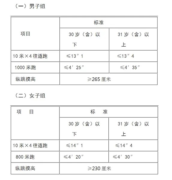 3.體能測評項(xiàng)目和標(biāo)準(zhǔn):按照《公安機(jī)關(guān)錄用人民警察體能測評項(xiàng)目和標(biāo)準(zhǔn)(暫行)》執(zhí)行。