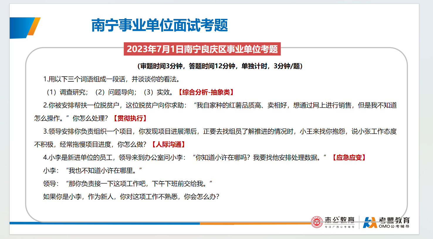 南寧事業(yè)單位面試主要采用結(jié)構(gòu)化面試形式、考查題量有3-4題,答題時(shí)間為9-12分鐘,考查題型:綜合分析(極高)、計(jì)劃組織(極高)、人際溝通(極高)、應(yīng)急應(yīng)變(一般)、貫徹執(zhí)行(一般)、自我認(rèn)知(一般):