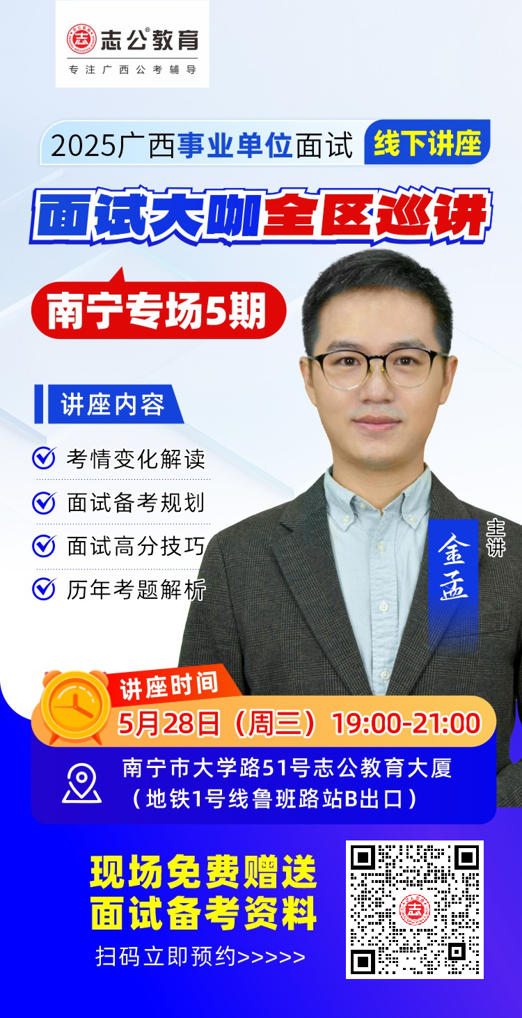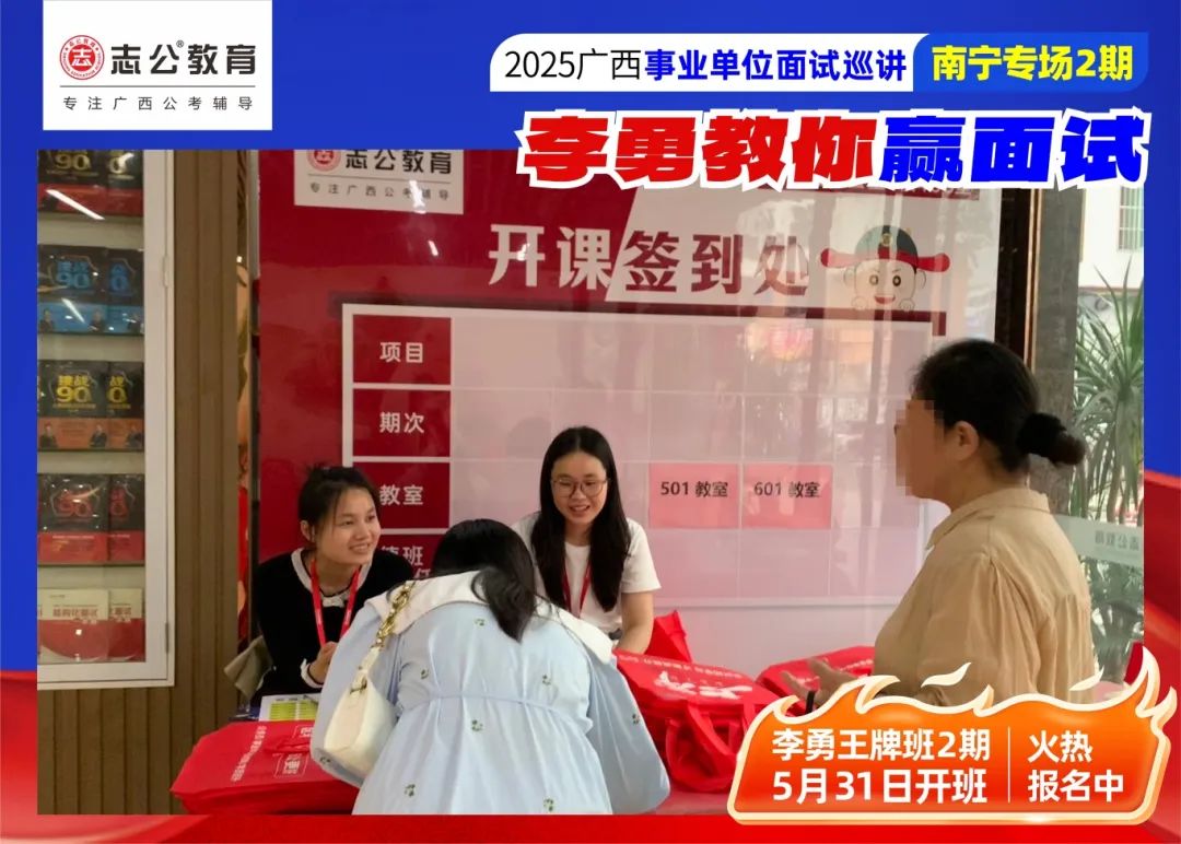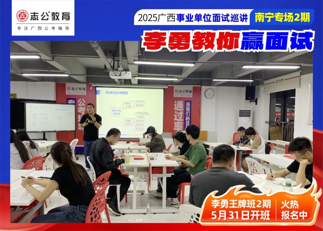 隨著2025廣西事業(yè)單位——李勇教你贏面試【南寧專場2期】線下巡講落幕,這場"面試攻堅戰(zhàn)",不僅點燃了備考熱情,更讓志公教育"幫助人才實現(xiàn)更高質(zhì)量的就業(yè)"的使命,在八桂大地結(jié)出更多碩果。
