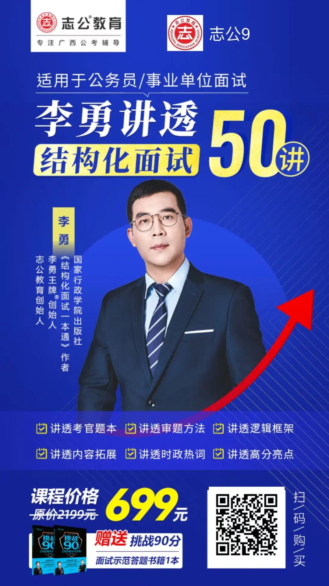李勇——志公教育創(chuàng)始人、李勇王牌®班創(chuàng)始人,志公教育名師。主講結(jié)構(gòu)化面試、結(jié)構(gòu)化小組面試,專注廣西公考輔導(dǎo)17年。獨(dú)創(chuàng)“萬變積木教學(xué)法”,擅長在教學(xué)中運(yùn)用金字塔原理和行動學(xué)習(xí),課堂生動有趣,形成獨(dú)特的授課體系。激發(fā)學(xué)員學(xué)習(xí)興趣的同時(shí)開發(fā)學(xué)員的潛能,讓學(xué)習(xí)事半功倍,幫助無數(shù)學(xué)子達(dá)成目標(biāo)。同時(shí)也是人民日報(bào)出版社《挑戰(zhàn)90分第三輯》作者。