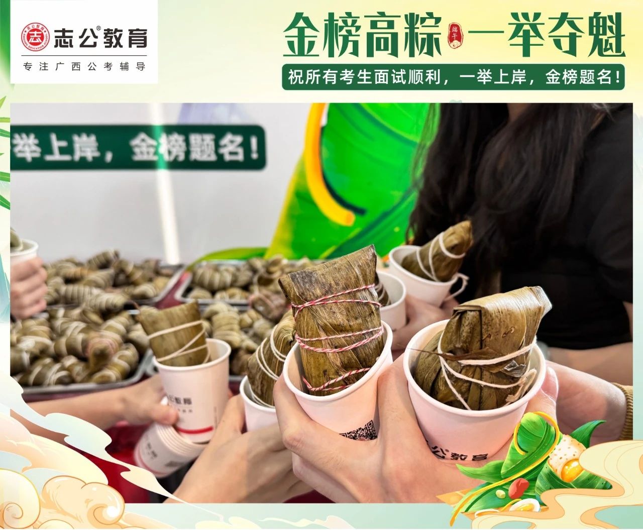 最后,再次祝愿大家端午節(jié)安康,六一兒童節(jié)快樂!愿志公教育每位員工在雙節(jié)的喜慶氛圍中,收獲滿滿,幸福常伴!也愿志公教育每位學(xué)員吃上粽子一舉高“粽”,實(shí)現(xiàn)自己的公職夢(mèng)想!