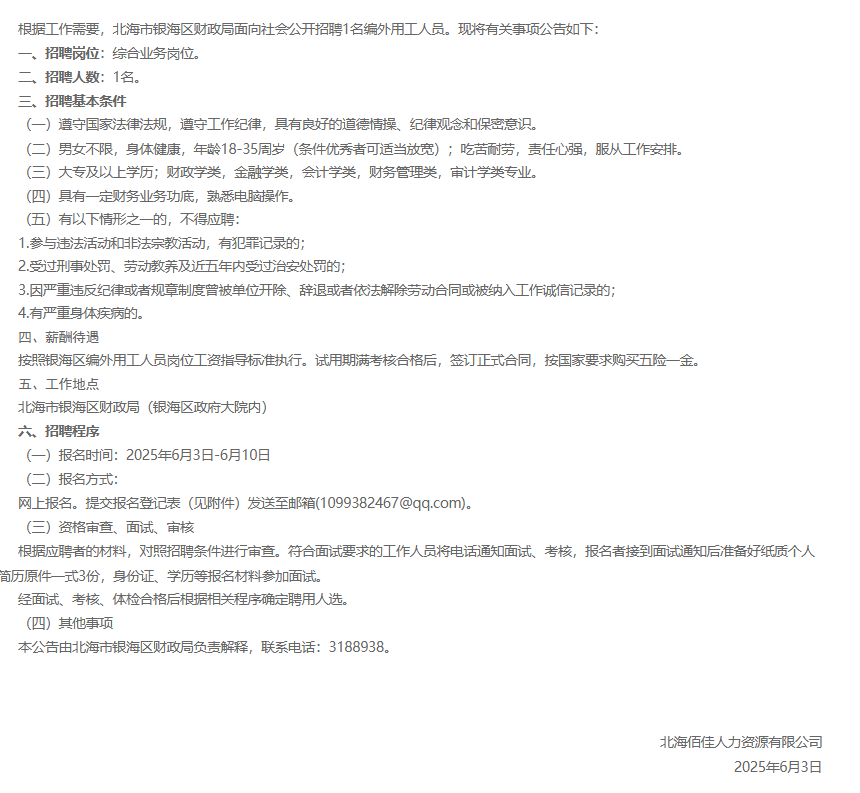 北海市銀海區(qū)財政局招聘編外用工人員公告