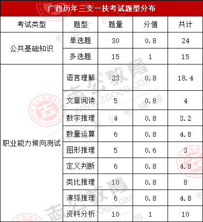 上篇我們寫(xiě)到,三支一扶的待遇,在廣西這個(gè)待遇還算不錯(cuò),政策上的支持也非常好,那么預(yù)計(jì)這個(gè)月月底出公告的三支一扶,啥時(shí)候筆試呢?2024年廣西三支一扶筆試時(shí)間是7月13日,其筆試科目為《綜合知識(shí)》一科,滿(mǎn)分100分?;谕昕忌幕貞?,綜合知識(shí)內(nèi)容主要包括公共基礎(chǔ)知識(shí)和行測(cè)職業(yè)能力測(cè)試兩個(gè)科目,而各題型的題量及分值如下圖所示: