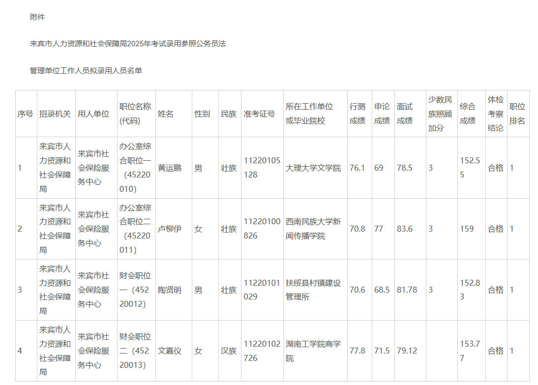 2025來(lái)賓人力資源和社會(huì)保障局公務(wù)員考試錄用工作人員擬錄用人員公示