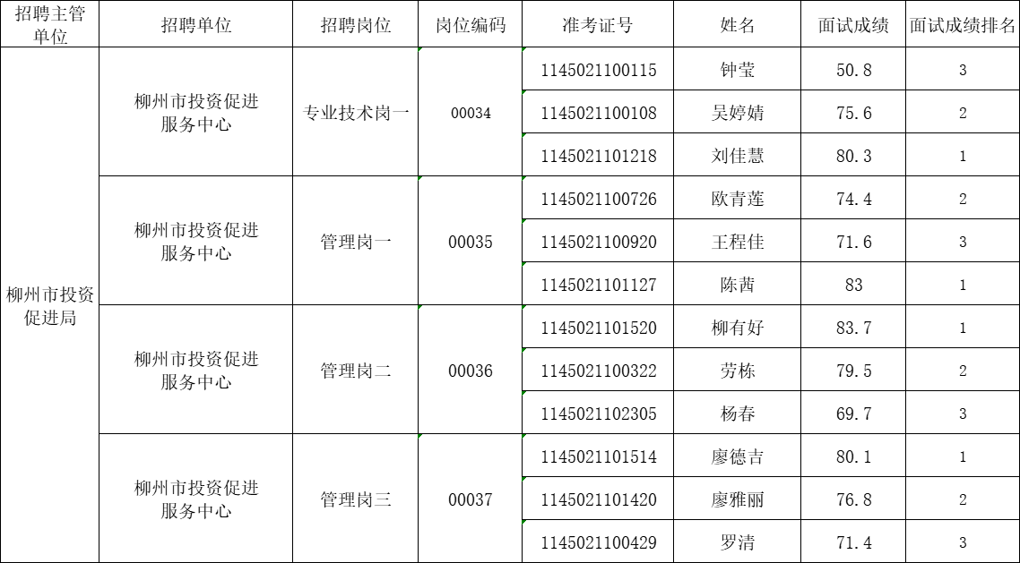 根據(jù)《2025年度柳州市事業(yè)單位公開考試招聘工作人員公告》要求及安排,柳州市投資促進(jìn)局所屬事業(yè)單位公開招聘工作人員面試工作已結(jié)束,面試考生成績?nèi)缦拢?