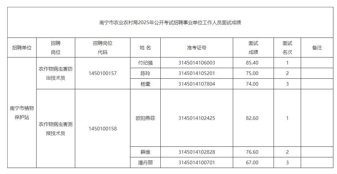 南寧市農(nóng)業(yè)農(nóng)村局2025年公開考試招聘事業(yè)單位工作人員面試成績