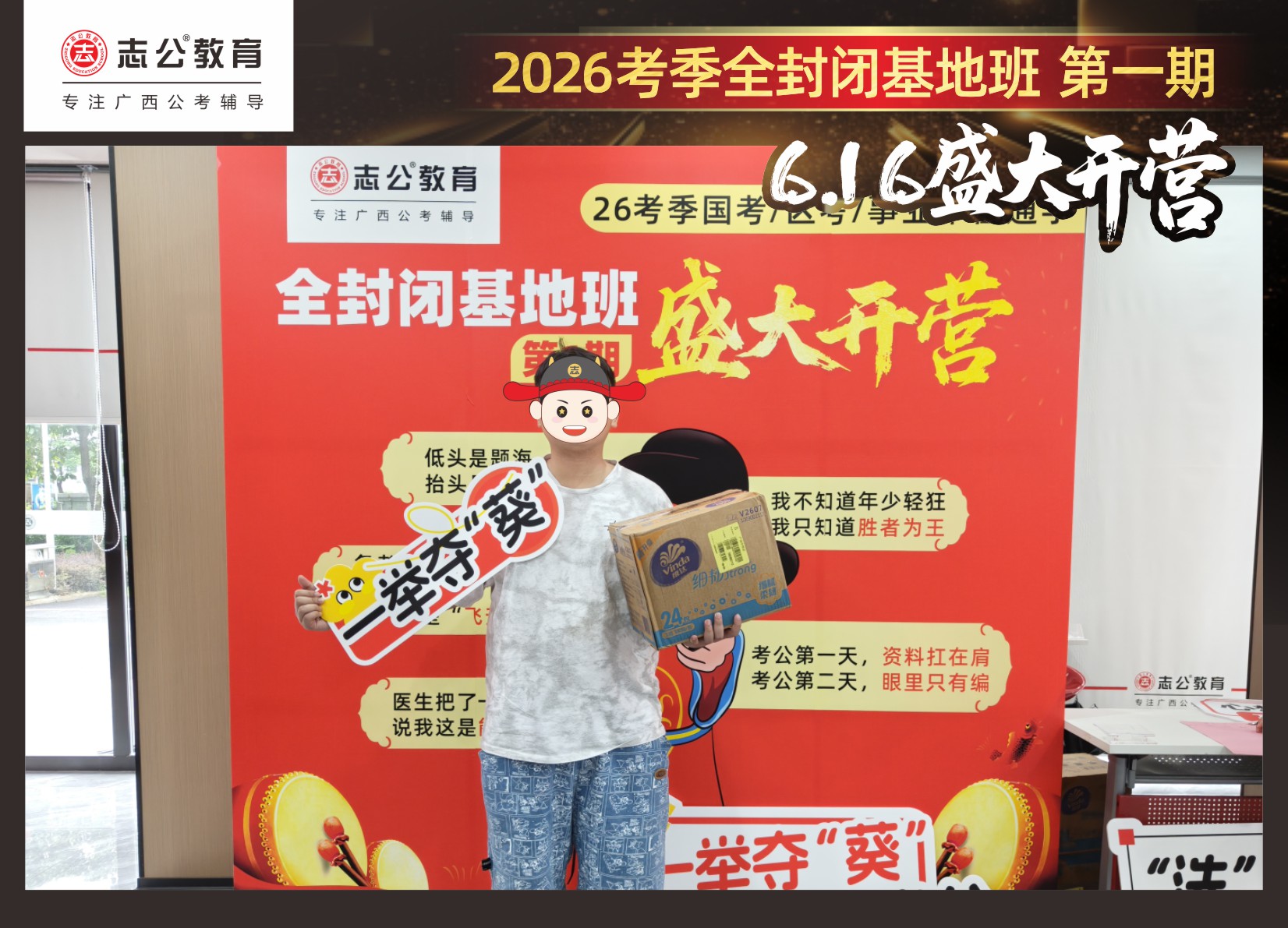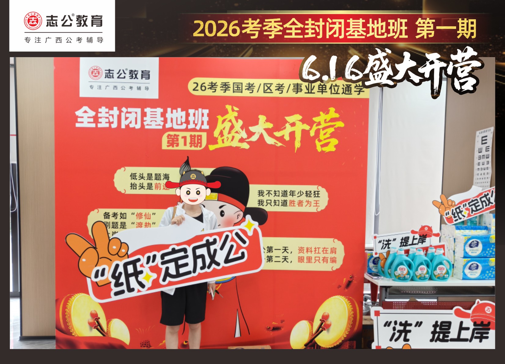 今天的開班還有一系列小活動噢~瞧!——“學(xué)員打卡活動”,所有今天到場的基地班學(xué)員,通過做一些小任務(wù)的方式,可以到前臺領(lǐng)取生活禮包即可領(lǐng)取生活禮品1份(一提六包的紙巾,或者一瓶洗衣液),這也是志公教育對所有學(xué)員的美好祝愿,預(yù)祝大家未來能夠“紙”定成公,“洗”提上/岸,“衣舉成公”!