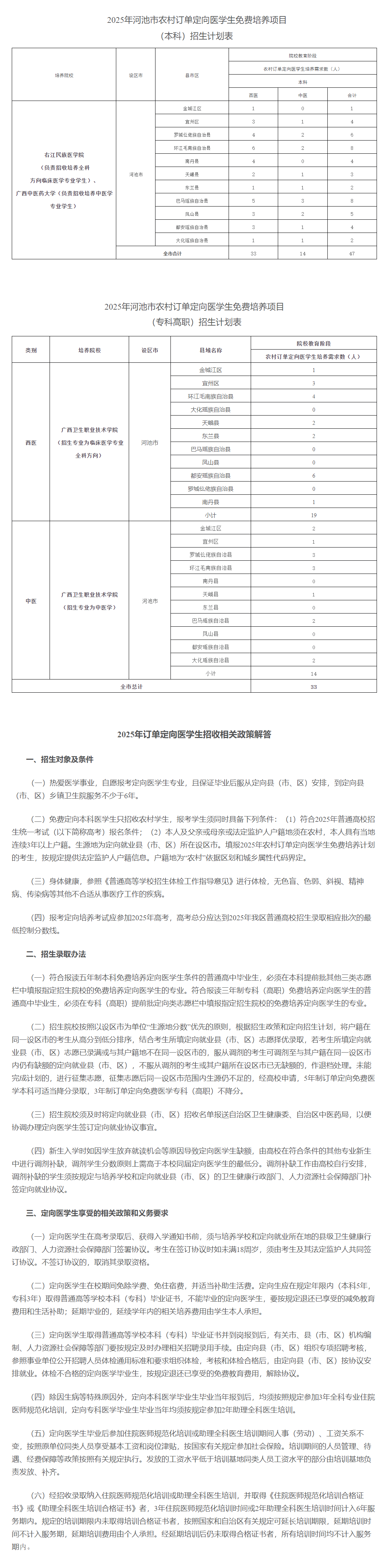 2025年,廣西繼續(xù)實(shí)施定向醫(yī)學(xué)生免費(fèi)培養(yǎng)項(xiàng)目,面向全區(qū)招生。河池市共有80個(gè)名額,其中,本科47個(gè),專科33個(gè),培養(yǎng)院校分別為:右江民族醫(yī)學(xué)院、廣西中醫(yī)藥大學(xué)、廣西衛(wèi)生職業(yè)技術(shù)學(xué)院,培養(yǎng)專業(yè)為臨床醫(yī)學(xué)和中醫(yī)學(xué)。