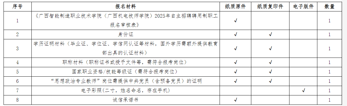 應(yīng)聘者按照招聘崗位具體要求對口報名,每名應(yīng)聘者限報一個崗位,采用現(xiàn)場報名遞交應(yīng)聘材料的方式報名。報名人員須下載并填寫《廣西智能制造職業(yè)技術(shù)學院(廣西機電技師學院)2025年自主招聘聘用制職工報名審核表》(附表2),同時需附上相應(yīng)的學歷、學位證書、身份證、職稱證書(相關(guān)崗位需要)等材料的原件與復(fù)印件(原件審核后退回,復(fù)印件不退回)