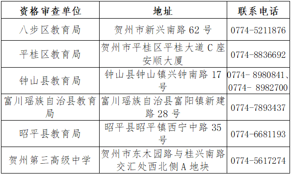詳見已發(fā)布的《2025年賀州市中小學(幼兒園)教師公開招聘簡章》附件1《2025年賀州市中小學(幼兒園)教師公開招聘崗位計劃表》,資格審查單位信息如下表: