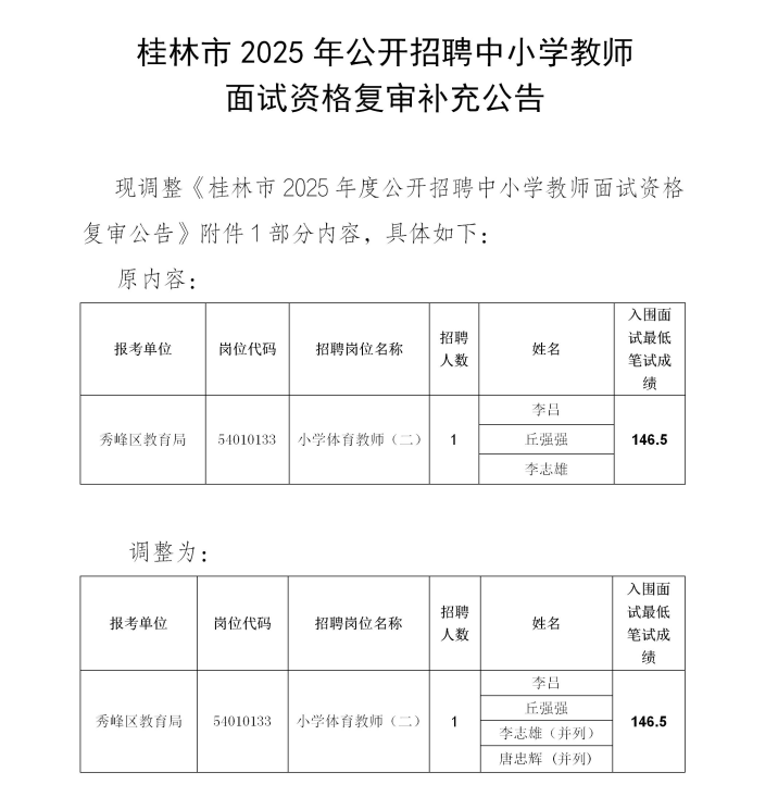 桂林市2025年公開招聘中小學教師面試資格復(fù)審補充公告