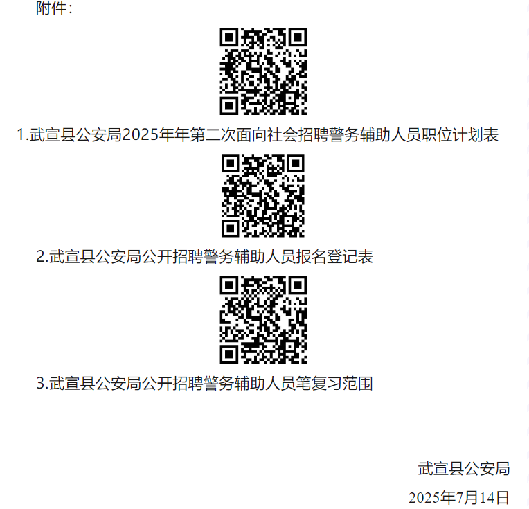 招聘人數(shù):8人,詳見《武宣縣公安局2025年第二次面向社會招聘輔警職位計劃表》(附件1)。