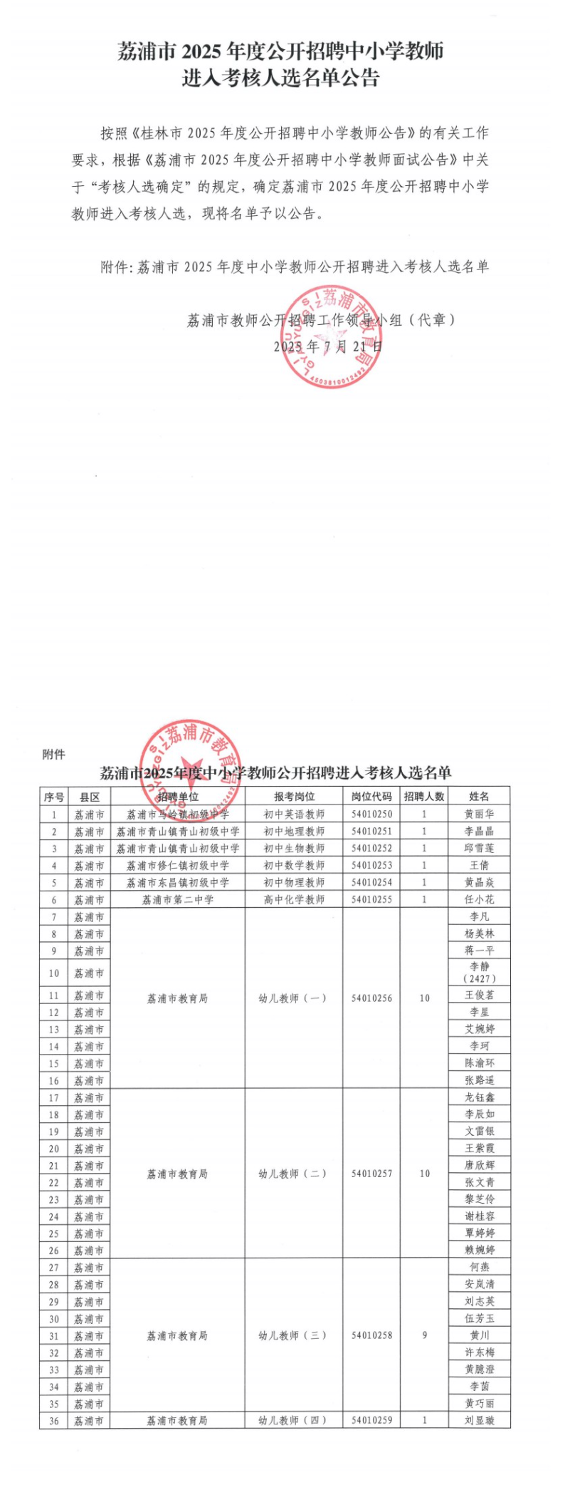 原文標(biāo)題:荔浦市2025年度公開招聘中小學(xué)教師進(jìn)入考核人選名單公告