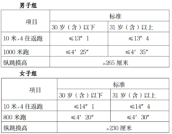 2.體測項(xiàng)目和標(biāo)準(zhǔn)。參照《關(guān)于印發(fā)公安機(jī)關(guān)錄用人民警察體能測評(píng)項(xiàng)目和標(biāo)準(zhǔn)(暫行)的通知》(人社部發(fā)〔2011〕48號(hào))的項(xiàng)目及測試規(guī)則,結(jié)合《公安民警體育鍛煉達(dá)標(biāo)手冊》成績標(biāo)準(zhǔn),本次體能測評(píng)的項(xiàng)目和標(biāo)準(zhǔn)如下:
