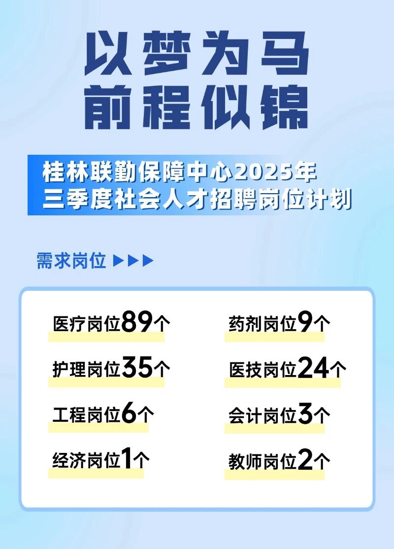 桂林聯(lián)勤保障中心2025年三季度社會人才招聘崗位計劃169個。