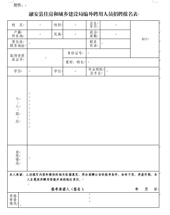 (1)報(bào)名方式:應(yīng)聘者將報(bào)名表等相關(guān)材料發(fā)送至融安縣住建局郵箱:raxjsj@163.com,報(bào)名材料主要包括:報(bào)名表(請(qǐng)自行下載填寫(xiě),并手寫(xiě)簽名)、身份證、學(xué)歷學(xué)位證書(shū)、資格證書(shū)、獲獎(jiǎng)證書(shū)等。以上材料均需掃描成PDF版本。