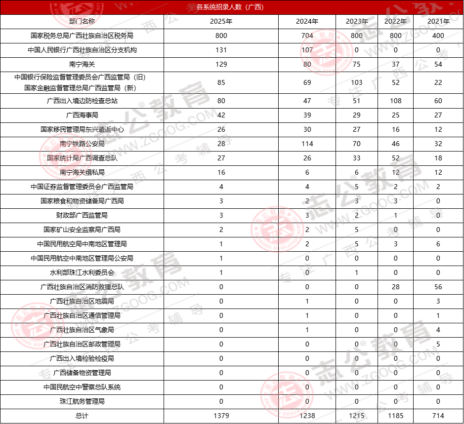 國(guó)家稅務(wù)總局廣西壯族自治區(qū)稅務(wù)局常年占據(jù)招錄首位,2025年以376個(gè)崗位、800人的招錄規(guī)模,占廣西總招錄人數(shù)的58%。此外,海關(guān)系統(tǒng)對(duì)廣西考生較為友好,平均入面分?jǐn)?shù)約117分,比稅務(wù)系統(tǒng)低5分以上,且常面向冷門(mén)專業(yè)招錄,可作為特色選擇。