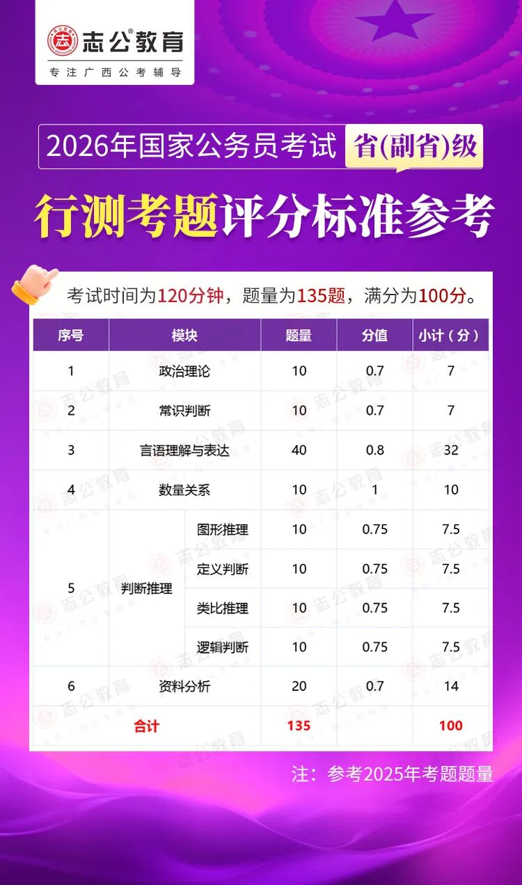無論報(bào)名人數(shù)是否會(huì)增加,提升自身實(shí)力才是應(yīng)對(duì)2026年國(guó)考的關(guān)鍵。行測(cè)作為國(guó)考公共科目筆試的核心模塊,不僅分值占比高(通常為 100 分),更是考生之間拉開分差的關(guān)鍵戰(zhàn)場(chǎng)。它并非單純考查知識(shí)儲(chǔ)備,而是通過言語理解、判斷推理、數(shù)量關(guān)系、資料分析、常識(shí)判斷、政治理論六大板塊,綜合評(píng)估考生的信息處理速度、邏輯思維能力、應(yīng)急決策水平等綜合素質(zhì)。