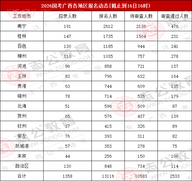 截止到16日16時(shí),2026國考廣西地區(qū)各地市報(bào)名人數(shù)最多的地市為南寧、桂林、百色,其中南寧報(bào)名人數(shù)為2612人,位居第一!整體報(bào)考人數(shù)達(dá)13116人!對此,小志建議大家,報(bào)考崗位時(shí)需將自身職業(yè)愿景與個人實(shí)際條件(如專業(yè)、學(xué)歷、基層經(jīng)驗(yàn)等)緊密結(jié)合,理性分析崗位競爭情況,最終做出最適合自己的選擇。