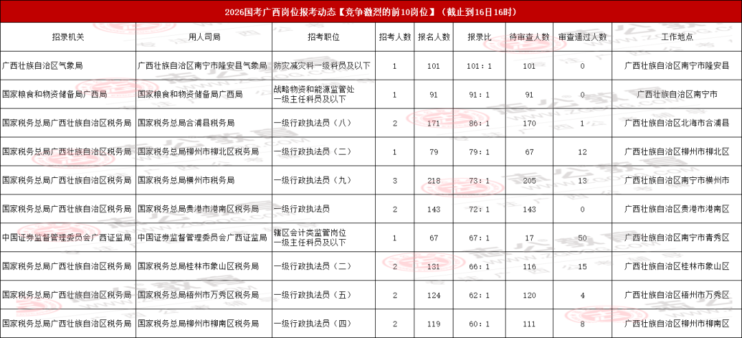 我們接著來看廣西地區(qū)國考報(bào)名競爭最激烈的前十職位匯總情況。當(dāng)前,國家稅務(wù)總局廣西壯族自治區(qū)稅務(wù)局-國家稅務(wù)總局桂林市臨桂區(qū)稅務(wù)局的【一級行政執(zhí)法員(三)】 職位,以220人的報(bào)名數(shù)成為目前前十職位中最熱門的選擇。