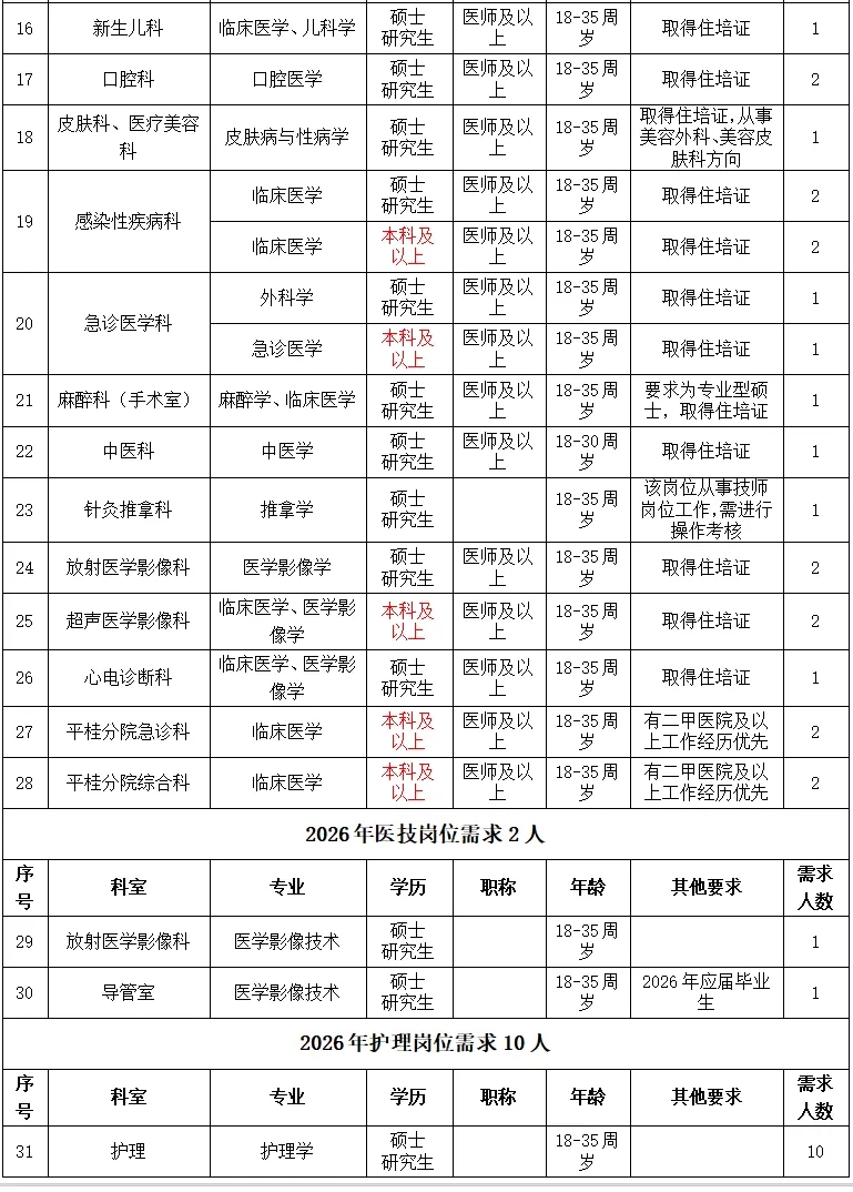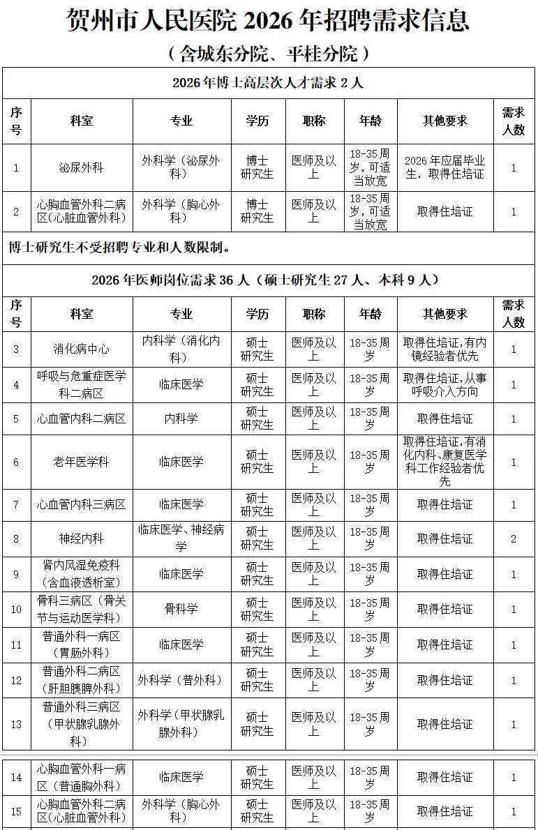 根據(jù)醫(yī)院發(fā)展規(guī)劃,招聘工作堅(jiān)持公平公正公開,堅(jiān)持德才兼?zhèn)洹⑷藣徬噙m、擇優(yōu)錄取、雙向選擇的原則,2026年計(jì)劃引進(jìn)博士、碩士高層次人才及招聘工作人員共計(jì)50名(詳見附件:賀州市人民醫(yī)院2026年招聘需求信息)。