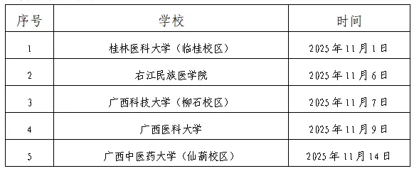 采取現(xiàn)場報(bào)名方式的人員請(qǐng)前往桂林醫(yī)科大學(xué)、右江民族醫(yī)學(xué)院、廣西科技大學(xué)、廣西醫(yī)科大學(xué)、廣西中醫(yī)藥大學(xué)等區(qū)內(nèi)各院校雙選會(huì)現(xiàn)場進(jìn)行應(yīng)聘。廣西區(qū)內(nèi)各院校雙選會(huì)舉辦時(shí)間詳見下表。