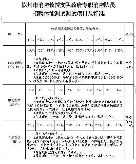 2.體能測試:(1)必考項(xiàng)目:1000米跑;(2)選考項(xiàng)目:①立定跳遠(yuǎn)、原地跳高二選一;②單杠引體向上、俯臥撐二選一;③10米×4往返跑、100米跑二選一;(3)注意事項(xiàng):體能測試有兩項(xiàng)及兩項(xiàng)以上不得分的視為不合格(標(biāo)準(zhǔn)參照附件)。未按時(shí)參加或因身體原因無法測試者,視為自動放棄。