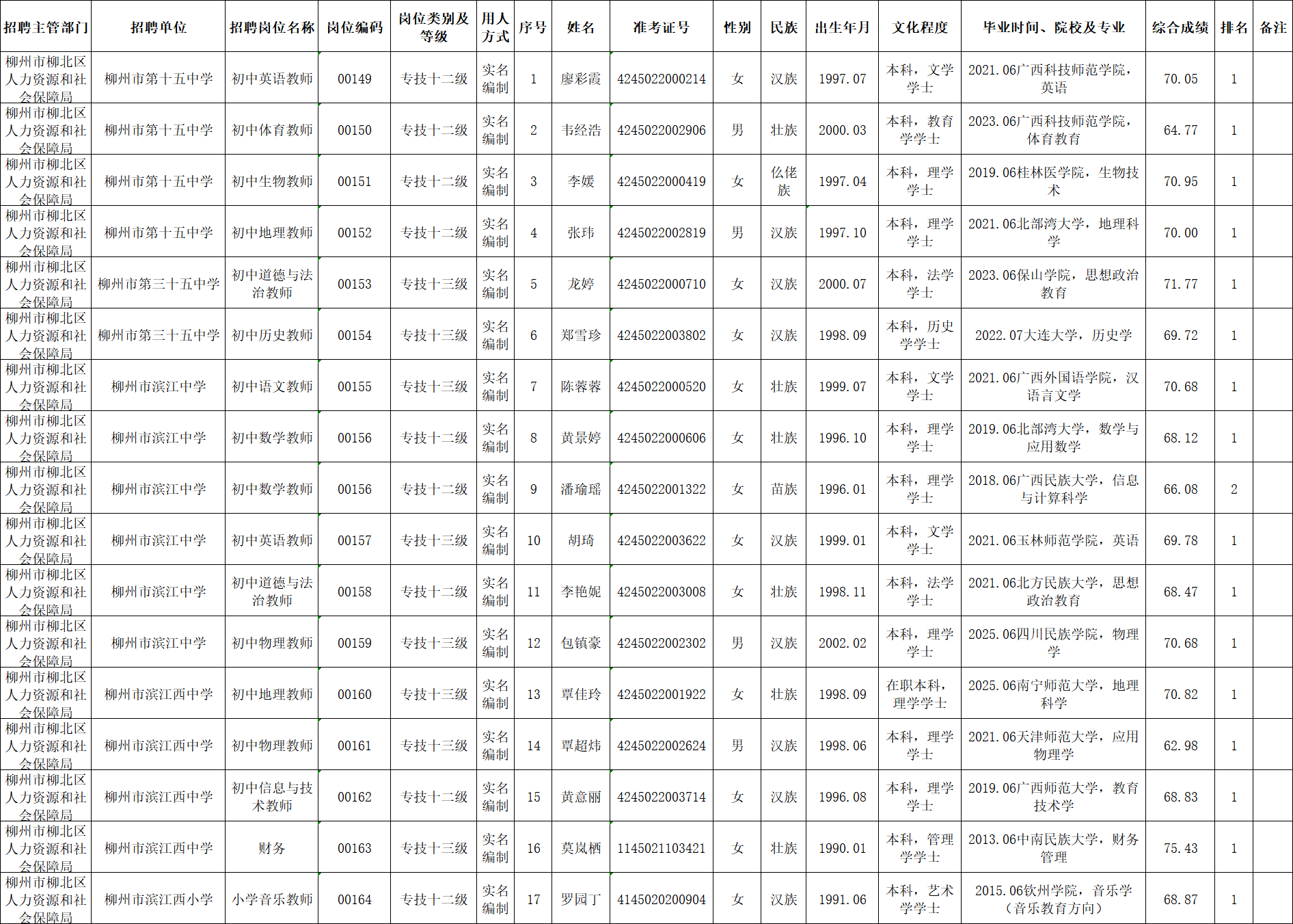 根據(jù)《柳州市2025年度下半年事業(yè)單位公開考試招聘工作人員公告》要求及安排,廖彩霞等17名同志經面試、考察、體檢合格,符合聘用條件。經研究決定,擬聘用廖彩霞等17名名同志為我區(qū)事業(yè)單位工作人員,現(xiàn)予以公示,公示期為5個工作日(2026年1月22日至2026年1月28日)。對擬聘用的同志如有異議,請以書面形式,并署真實姓名和聯(lián)系地址,于2026年1月28日前郵寄或直接送我單位(地址:柳州市勝利路12-8號柳北區(qū)政府3樓307室;郵編:545002,電話0772-2539121),群眾如實反映有關問題受法律保護。