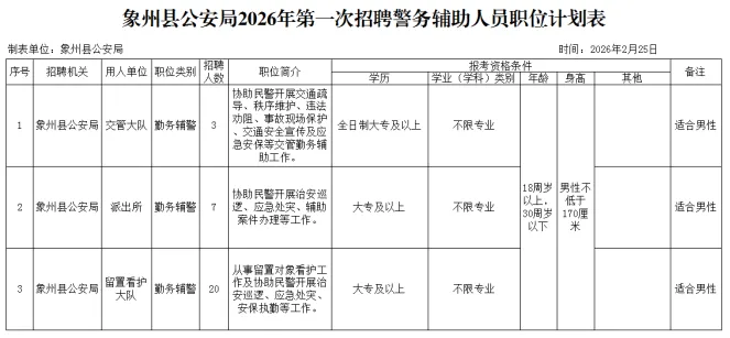 (一)招聘人數(shù):30人,詳見(jiàn)《象州縣公安局2026年第一次公開(kāi)招聘警務(wù)輔助人員職位計(jì)劃表》(附件1)