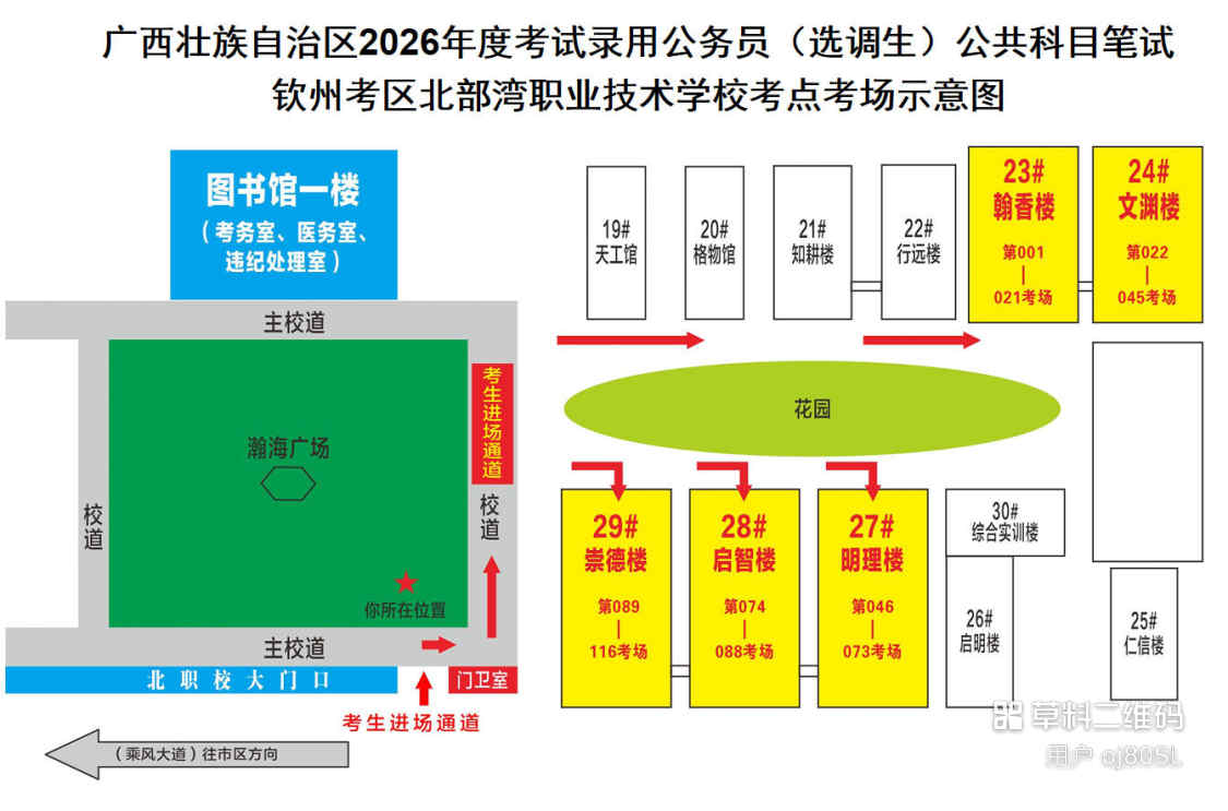 欽州考區(qū)共設(shè)三個考點,分別為北部灣大學(xué)考點、北部灣職業(yè)技術(shù)學(xué)??键c、欽州市第五中學(xué)考點。(考點地址和具體考場安排請掃附后的二維碼查看)