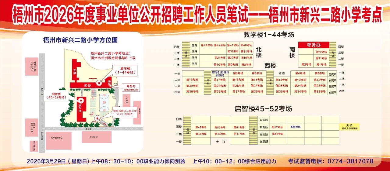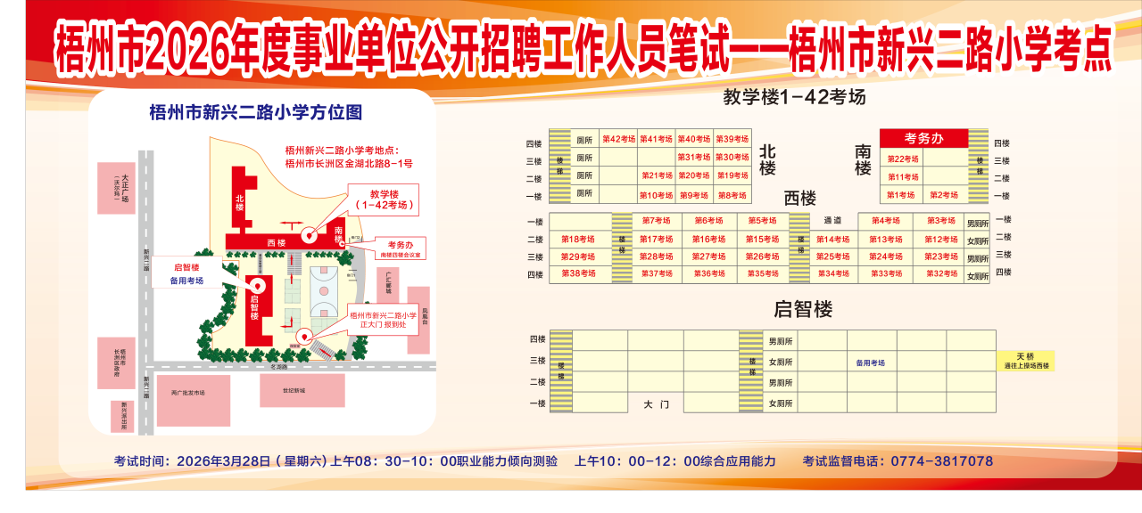 請(qǐng)考生提前熟悉各自考點(diǎn)位置、周邊環(huán)境及交通情況,考試當(dāng)天提前出門做好準(zhǔn)備,準(zhǔn)時(shí)參加考試。特別提示:因考點(diǎn)停車場(chǎng)地有限,所有考生車輛不得進(jìn)入考點(diǎn),請(qǐng)考生規(guī)劃好前往考點(diǎn)的交通方式和路線。此外,萬秀區(qū)西堤二路新華路口至豐業(yè)藍(lán)天港灣段、長(zhǎng)洲區(qū)西堤三路梧州市人力資源和社會(huì)保障局至奧奇麗路口段道路實(shí)施臨時(shí)交通管制措施,如果考生通往考點(diǎn)途經(jīng)此路段,請(qǐng)?zhí)崆耙?guī)劃路線和出行時(shí)間。