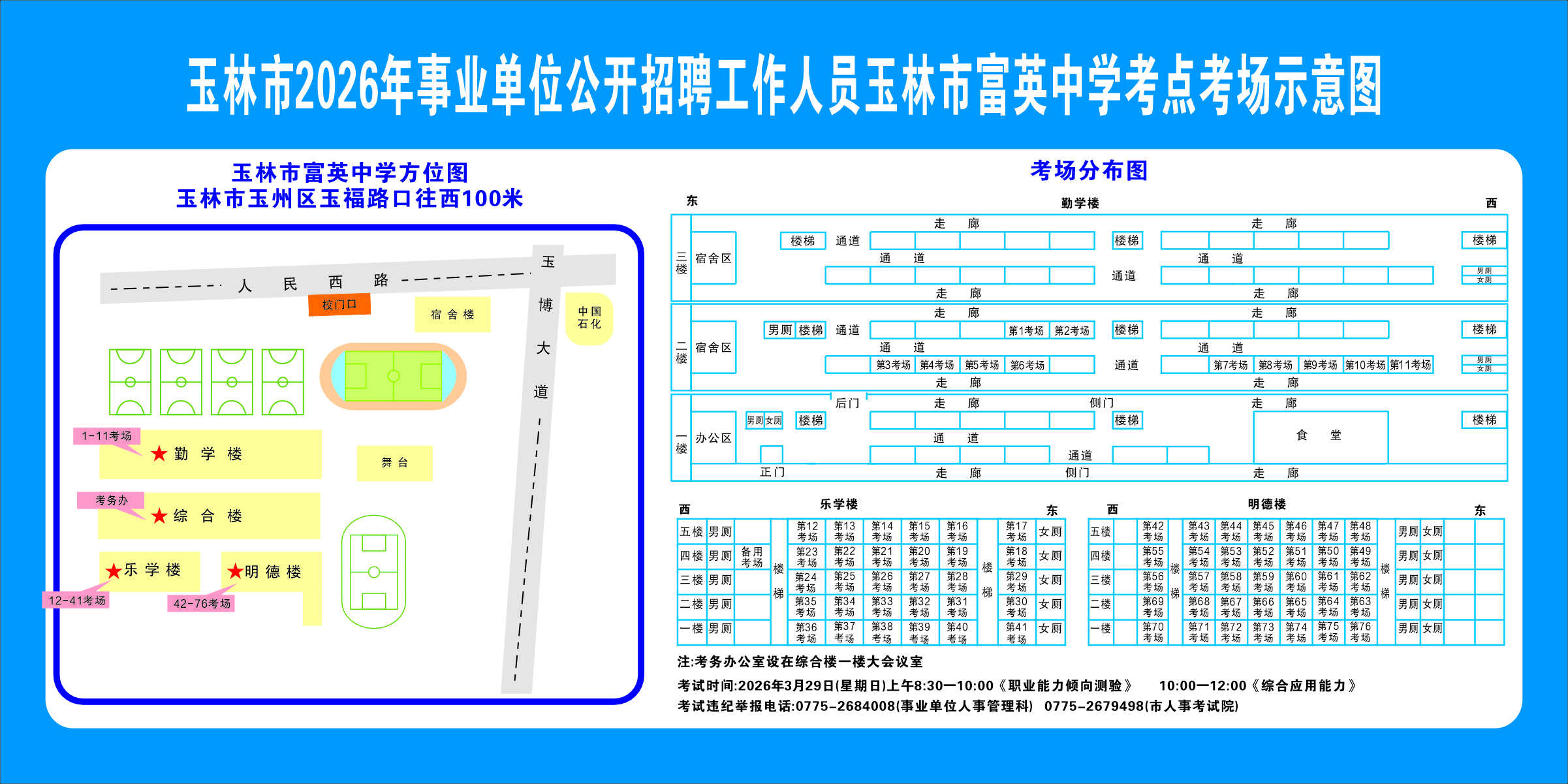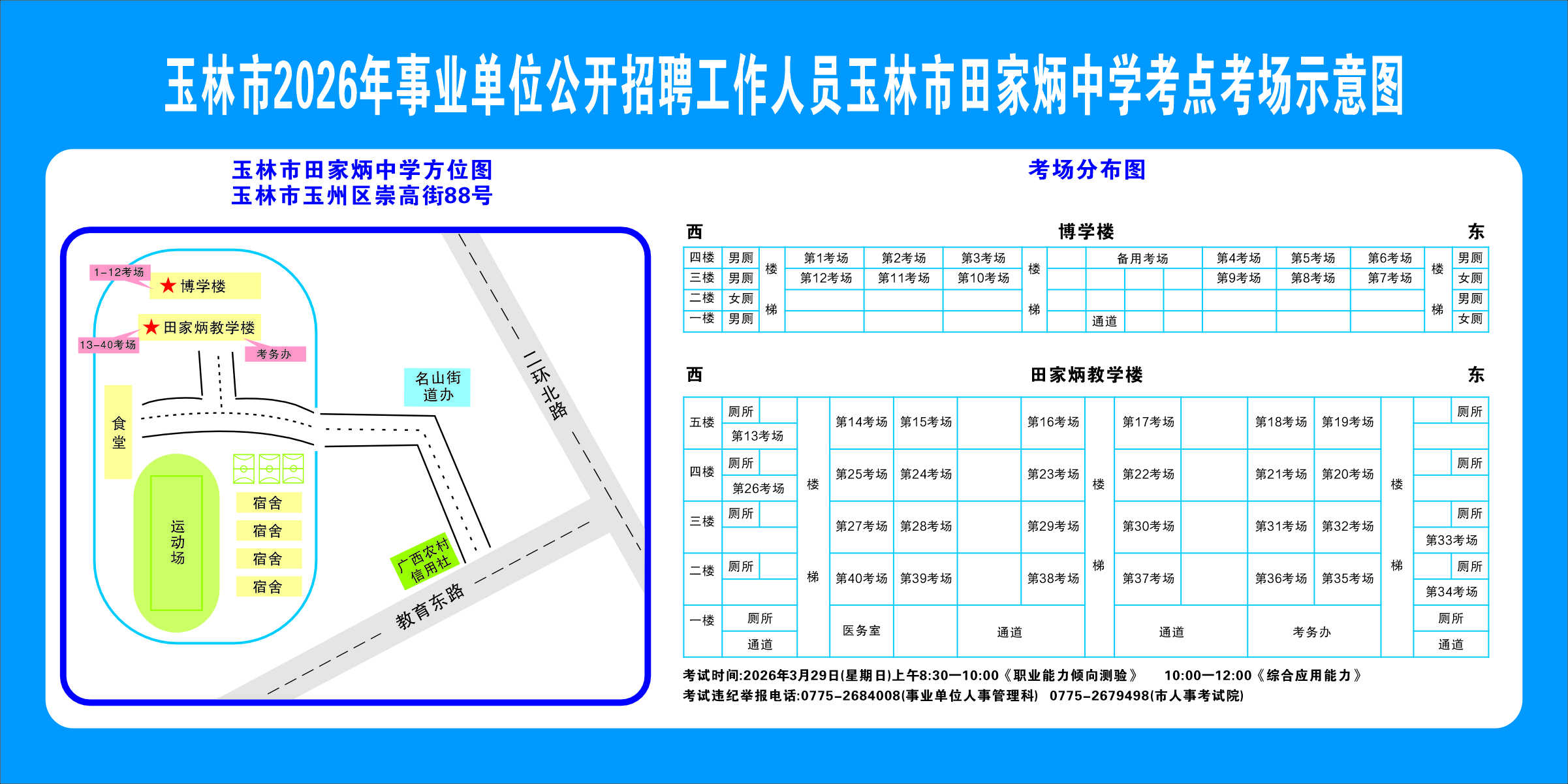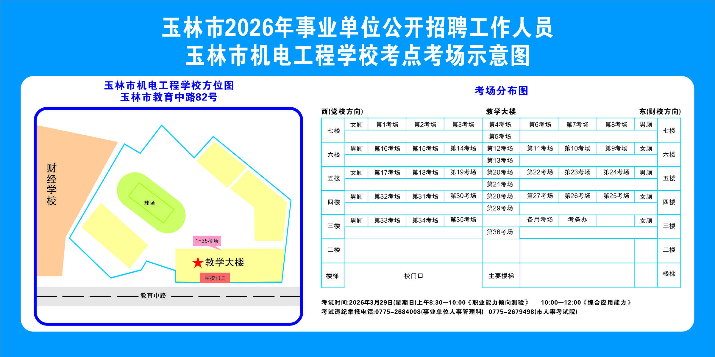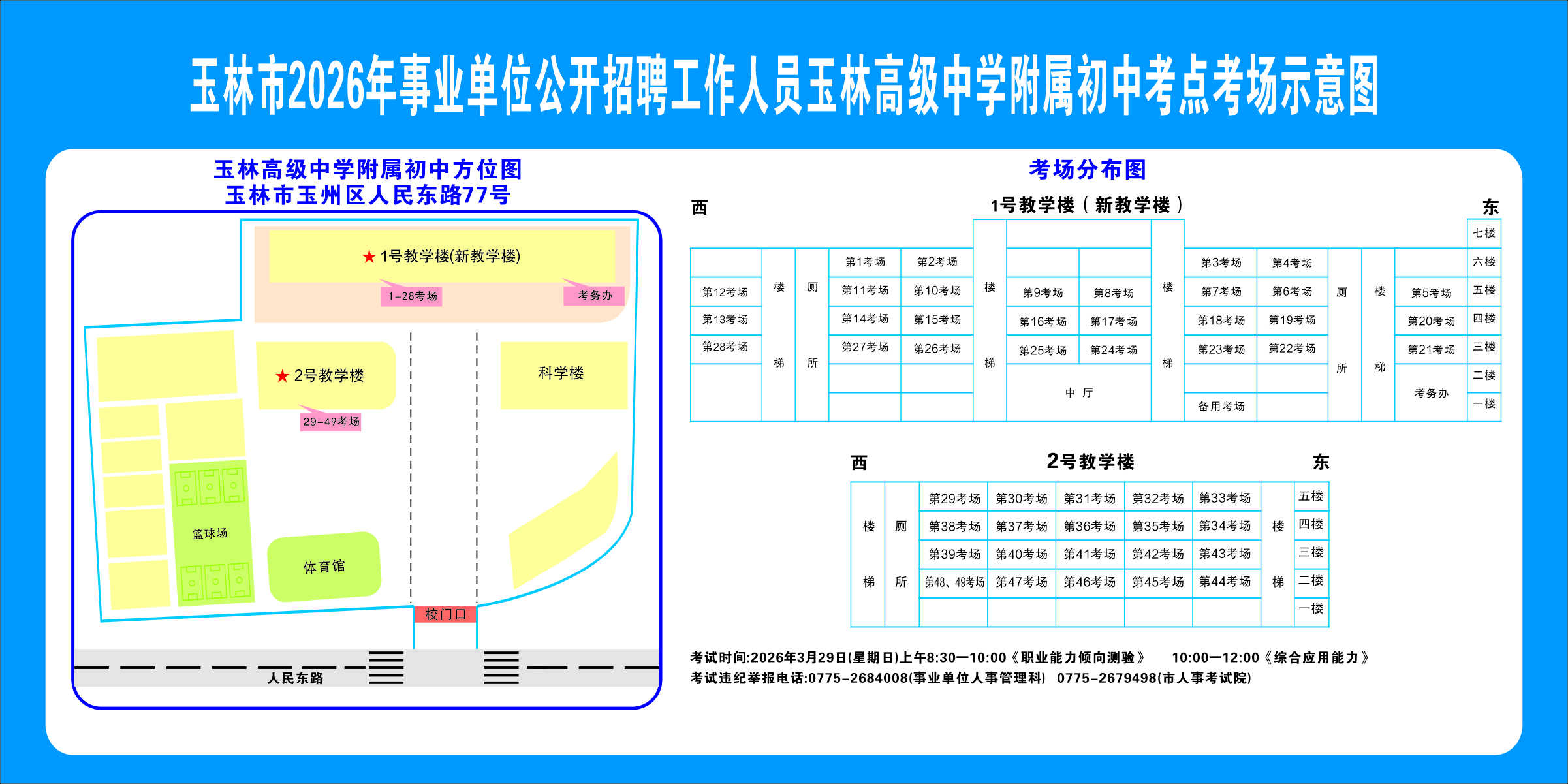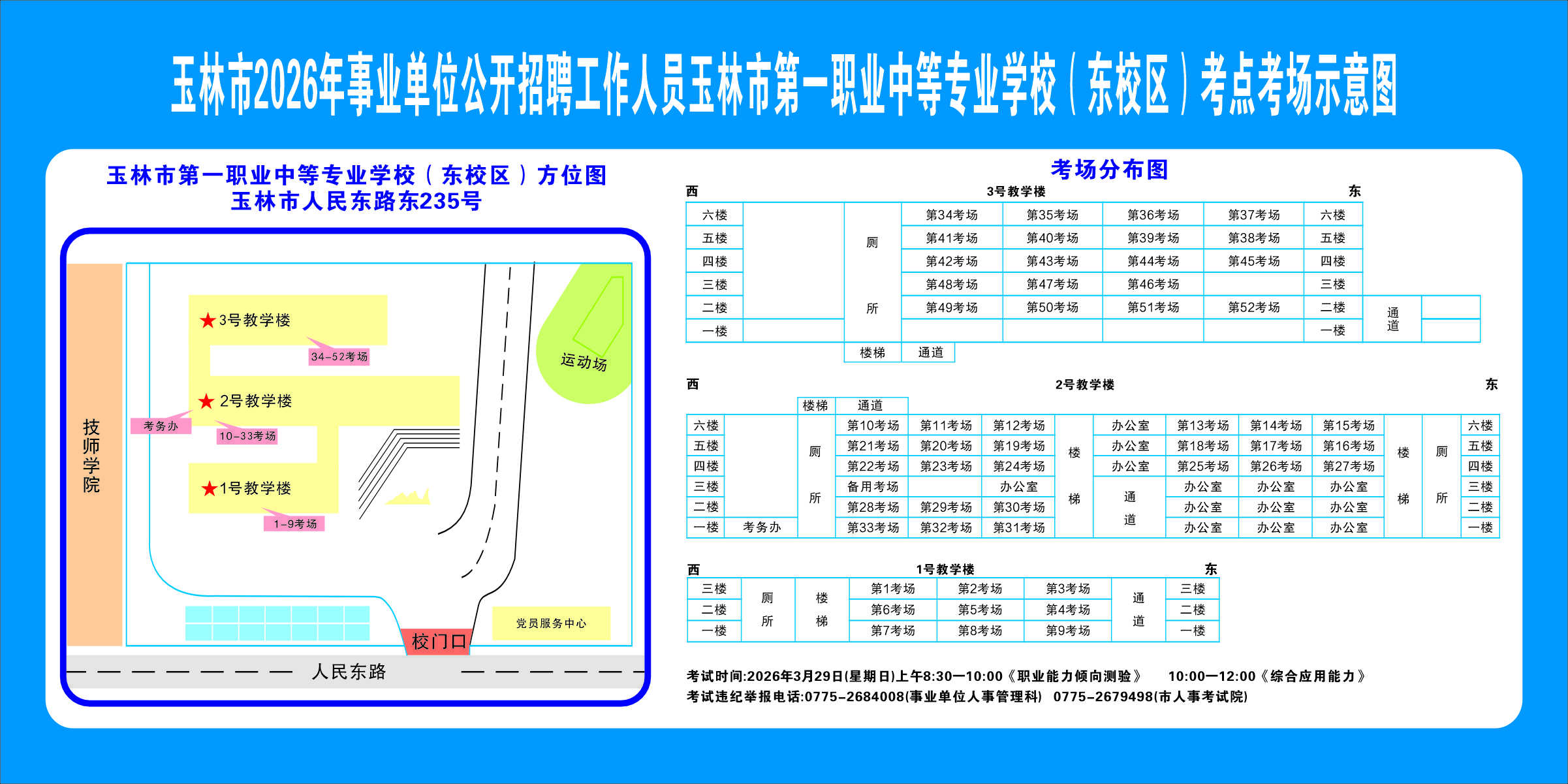 2.需要特別注意的是:玉林市第一職業(yè)中等專(zhuān)業(yè)學(xué)??键c(diǎn)是設(shè)在該校的東校區(qū)(人民東路東235號(hào));玉林市第一中學(xué)考點(diǎn)分為運(yùn)嶺路校區(qū)(二環(huán)北路1228號(hào))、大北路校區(qū)(大北路453號(hào))。
