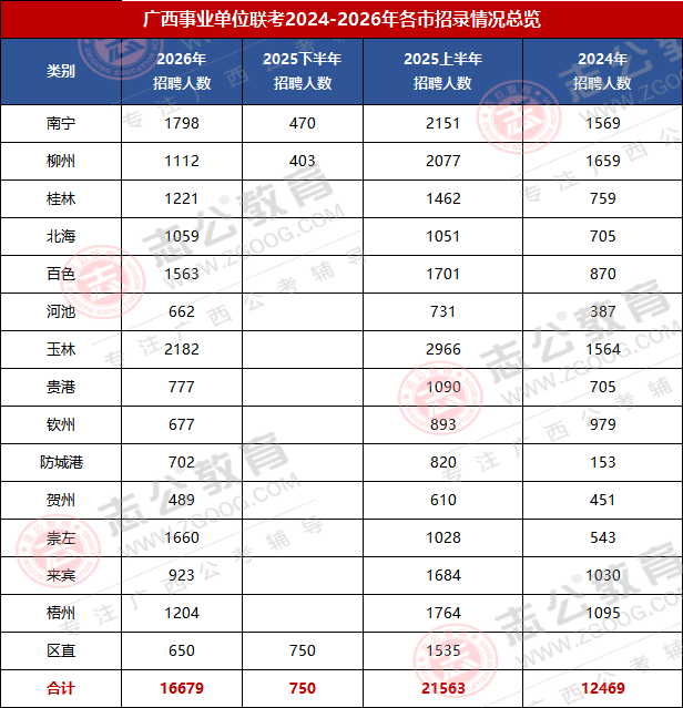 2026廣西事考招錄16679人,較2025上半年廣西事業(yè)單位招錄縮招了4884人;招錄波動大、但是機會集中,醫(yī)療E類、綜合A 類為招錄主力;廣西區(qū)直、南寧、桂林等崗位競爭激烈,是應屆生與社會考生圓夢重要賽道。