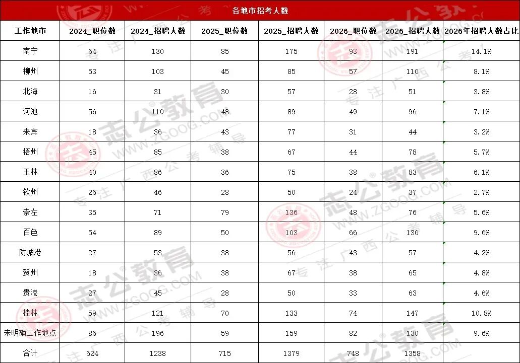 2026國考廣西招1358人,占全國招錄人數(shù)的3.56%,相比去年減少招錄人數(shù)21人。2026國考招錄人數(shù)呈縮減趨勢;基層崗位成主力;稅務、海關、邊檢為招錄大戶;應屆生身份紅利顯著,超60%崗位限應屆報考。
